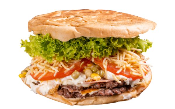 Pão, copa, hambúrguer, ovo, presunto, queijo, maionese, batata palha, milho,…